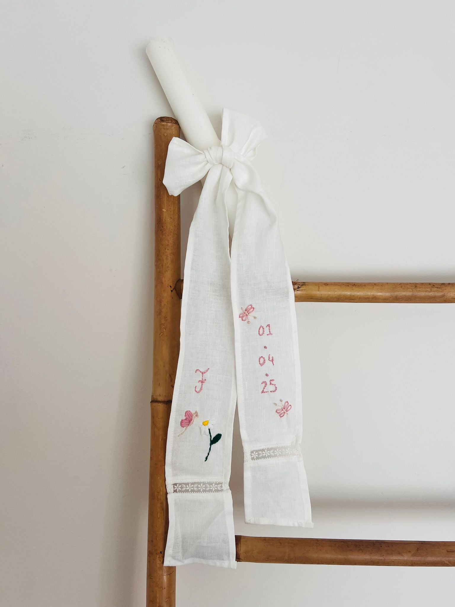 Um detalhe único e cheio de significado para eternizar o dia especial. A faixa em tecido branco delicado recebe bordados manuais personalizados — como iniciais, data da cerimónia e pequenos elementos decorativos (flores, borboletas, símbolos religiosos ou temáticos). Cada detalhe é feito à mão, conferindo exclusividade e um toque artesanal que torna a peça uma recordação inesquecível do batizado.