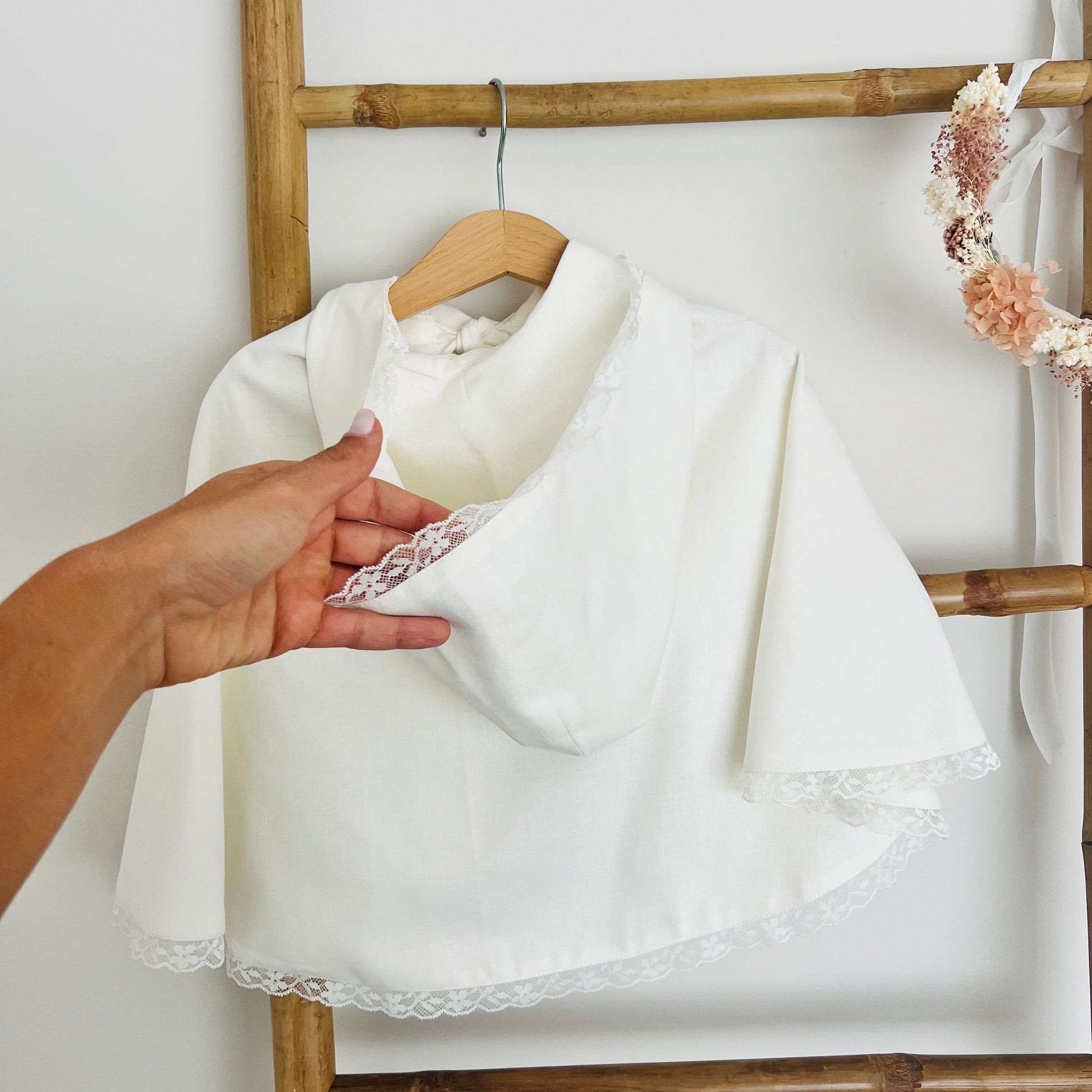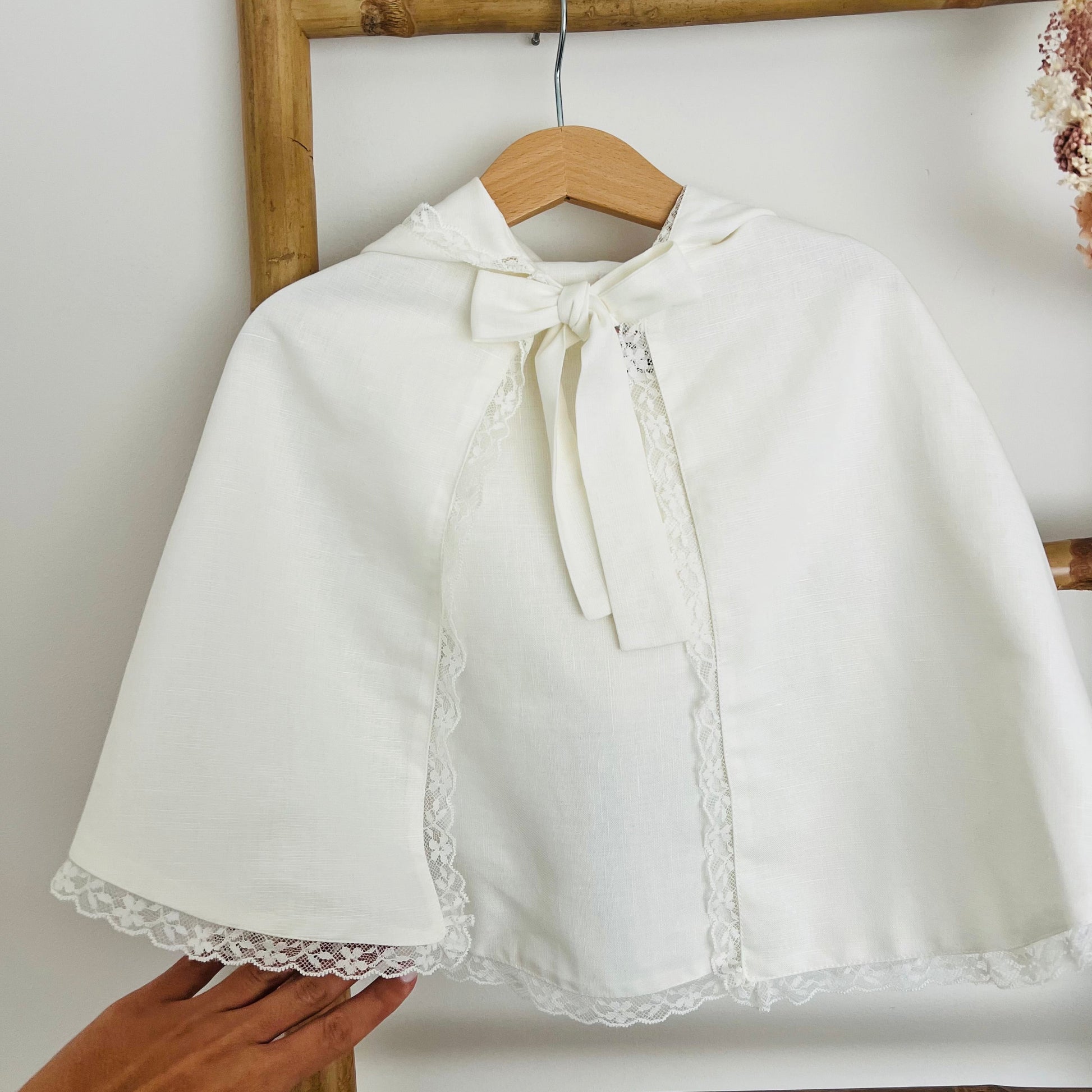 An elegant white linen cape with delicate lace carefully applied all around, perfect for complementing special looks. It can be produced in any color of your choice, making it perfectly adaptable to your taste and occasion. A unique piece that combines comfort, lightness, and sophistication.