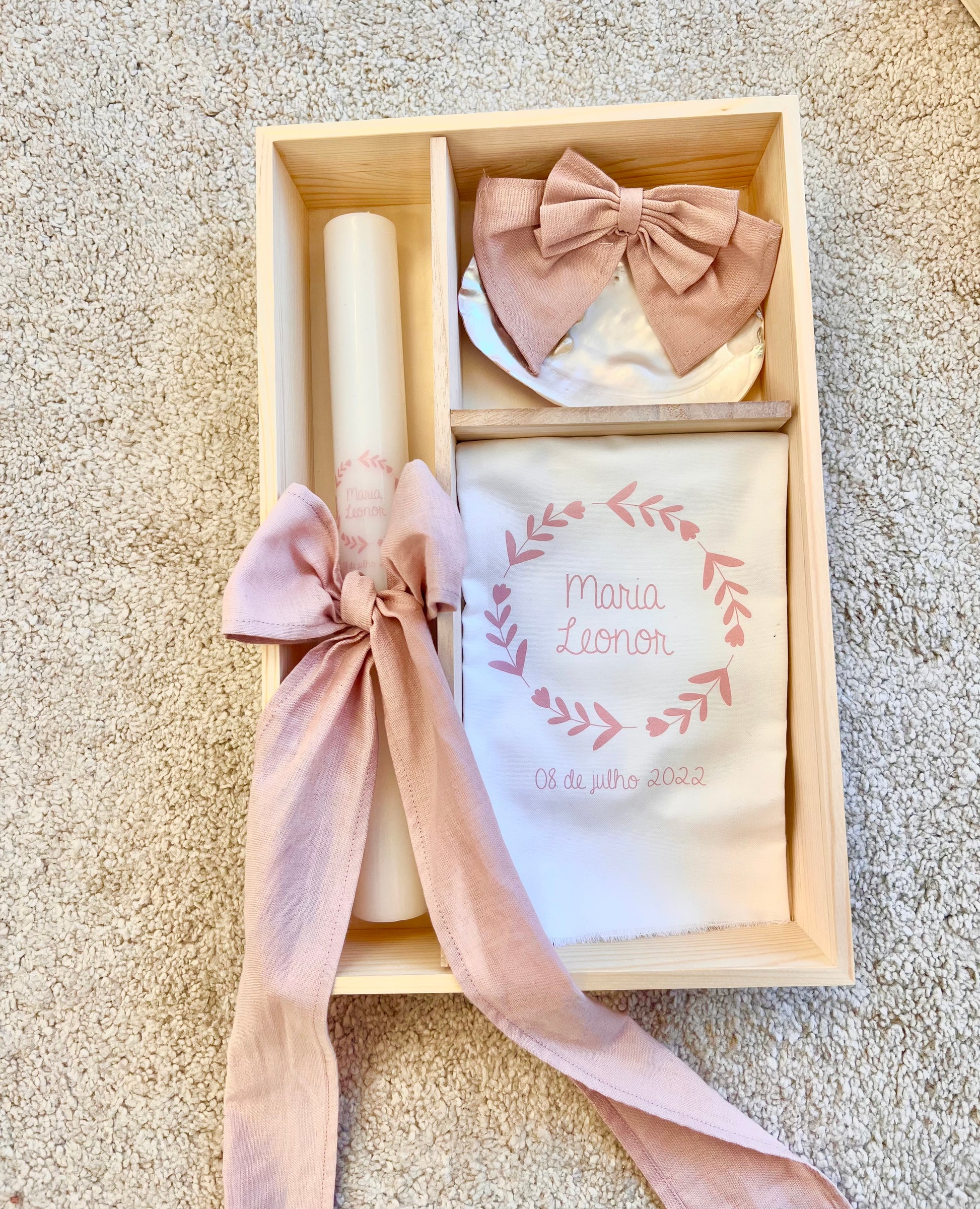 This baptism set includes all the essential elements to make the ceremony even more special: personalized box, towel, candle and mother-of-pearl shell .
