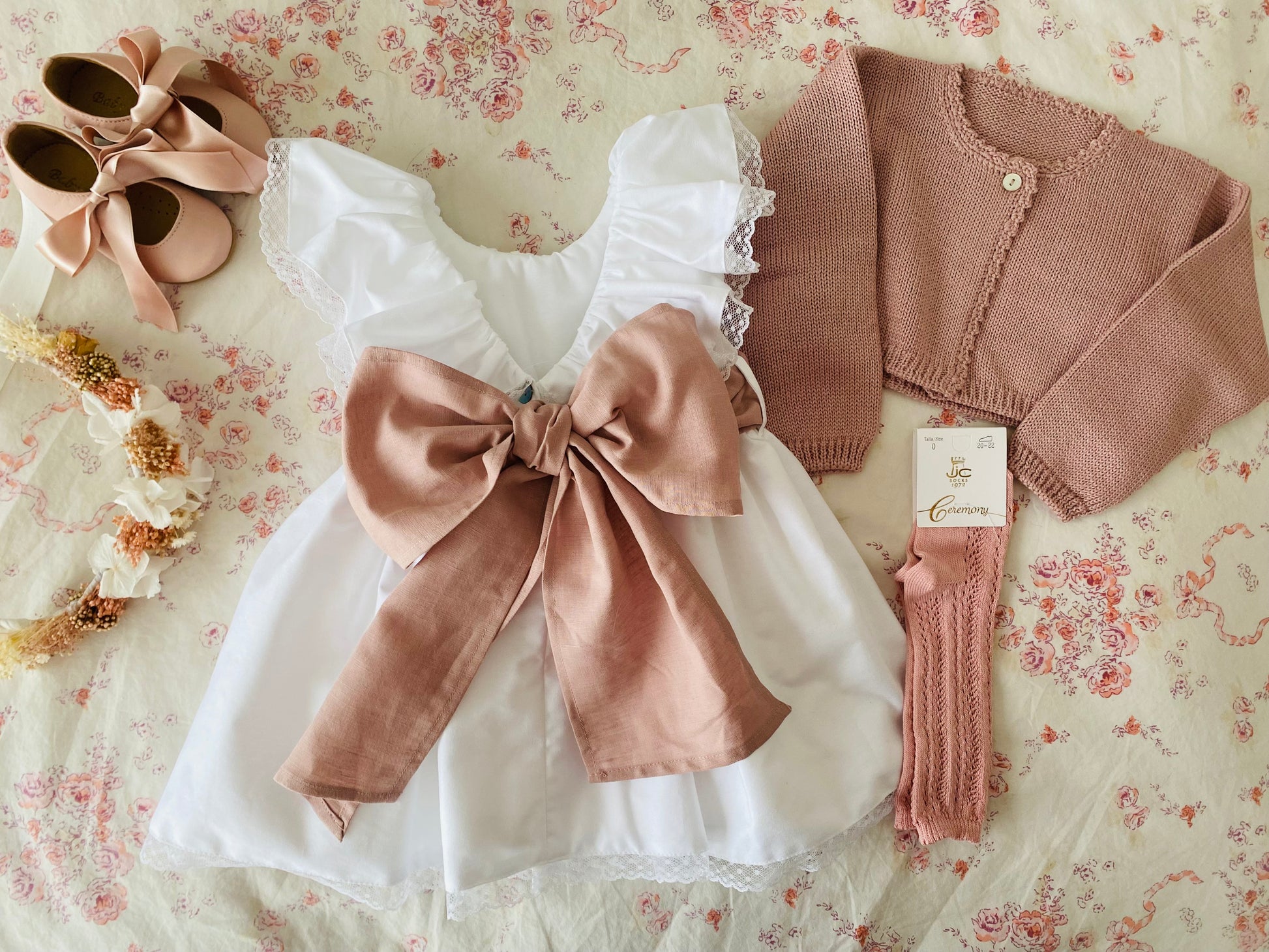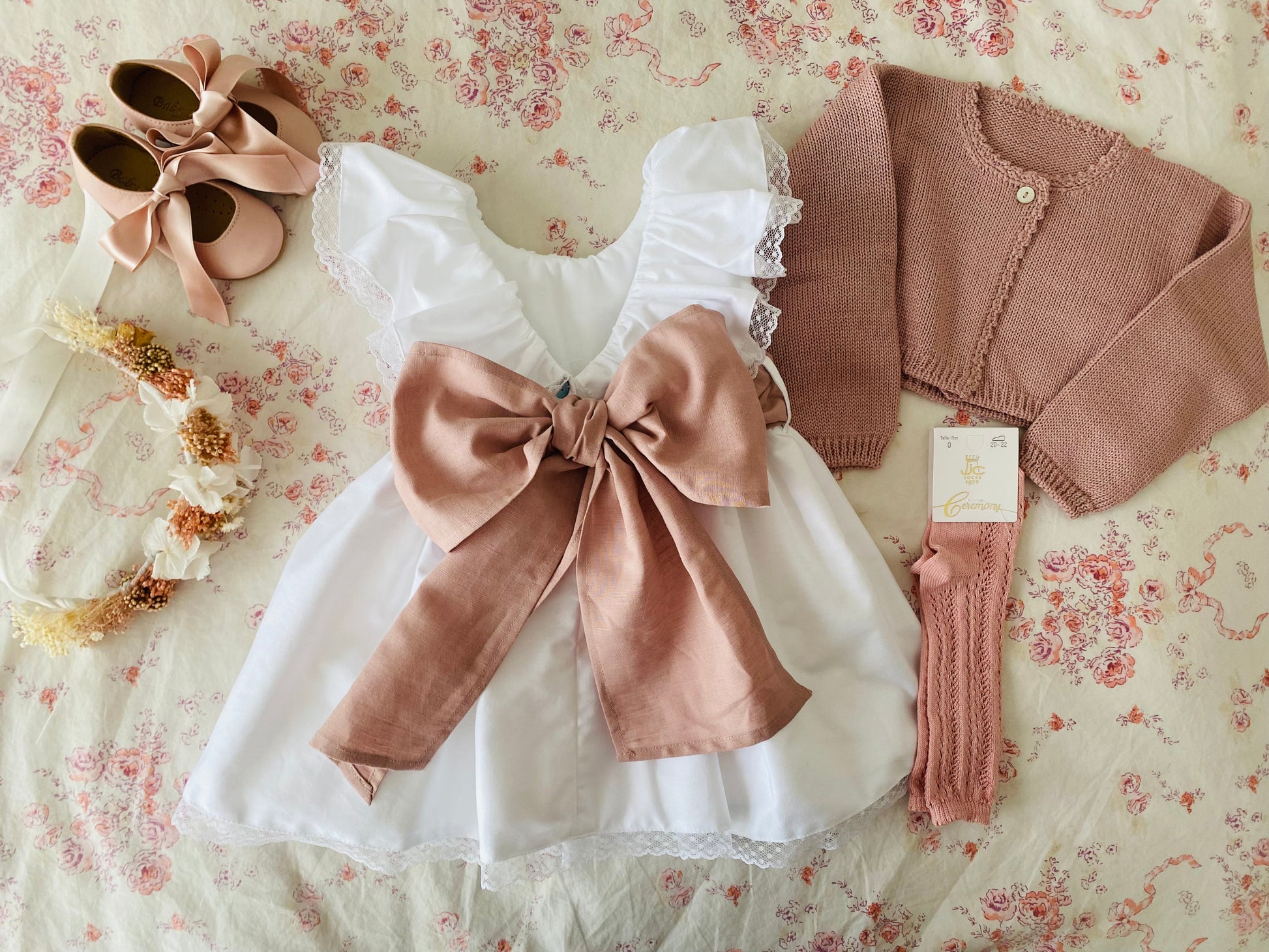 Shoes, headband, bolero, and matching socks. If this style is not in stock in the desired size, we will contact the customer.