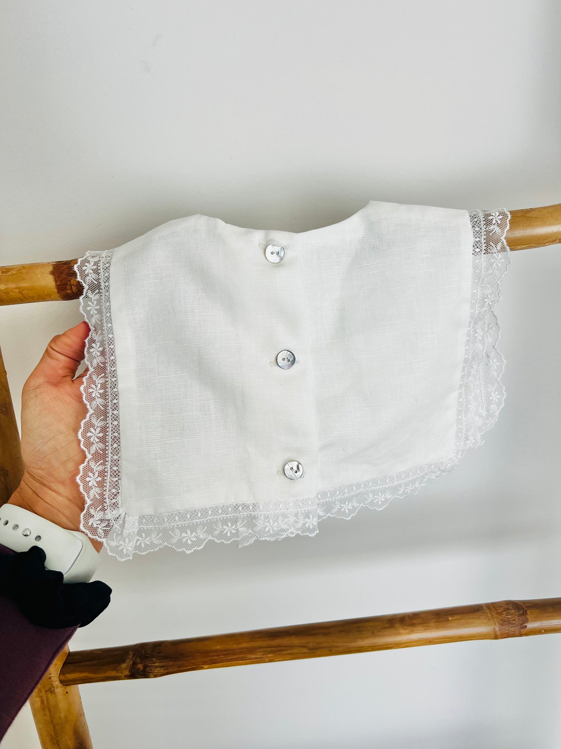 O modelo inclui botões atrás, permitindo um vestir fácil e seguro, garantindo conforto ao bebé durante toda a cerimónia. O corte suave e a atenção aos detalhes fazem deste escapulário uma peça essencial na roupa de batismo para bebé, perfeita para batizados, cerimónias religiosas e ocasiões especiais.