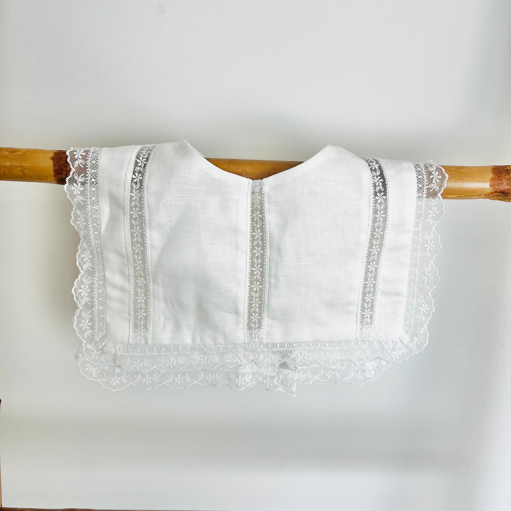 Escapulário de batismo elegante e delicado, ideal para complementar o traje de batismo do bebé com um toque tradicional e intemporal. Confeccionado em tecido leve e confortável, apresenta entremeios rendados cuidadosamente aplicados, que valorizam o design clássico e conferem um acabamento refinado e sofisticado.