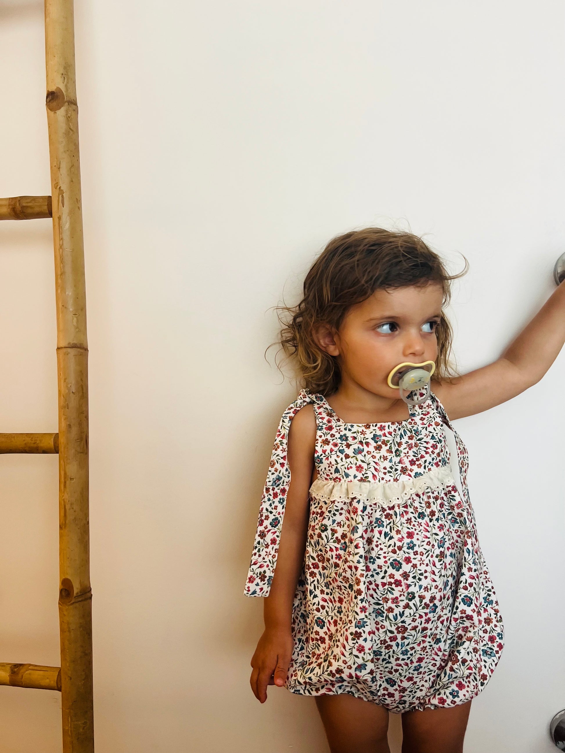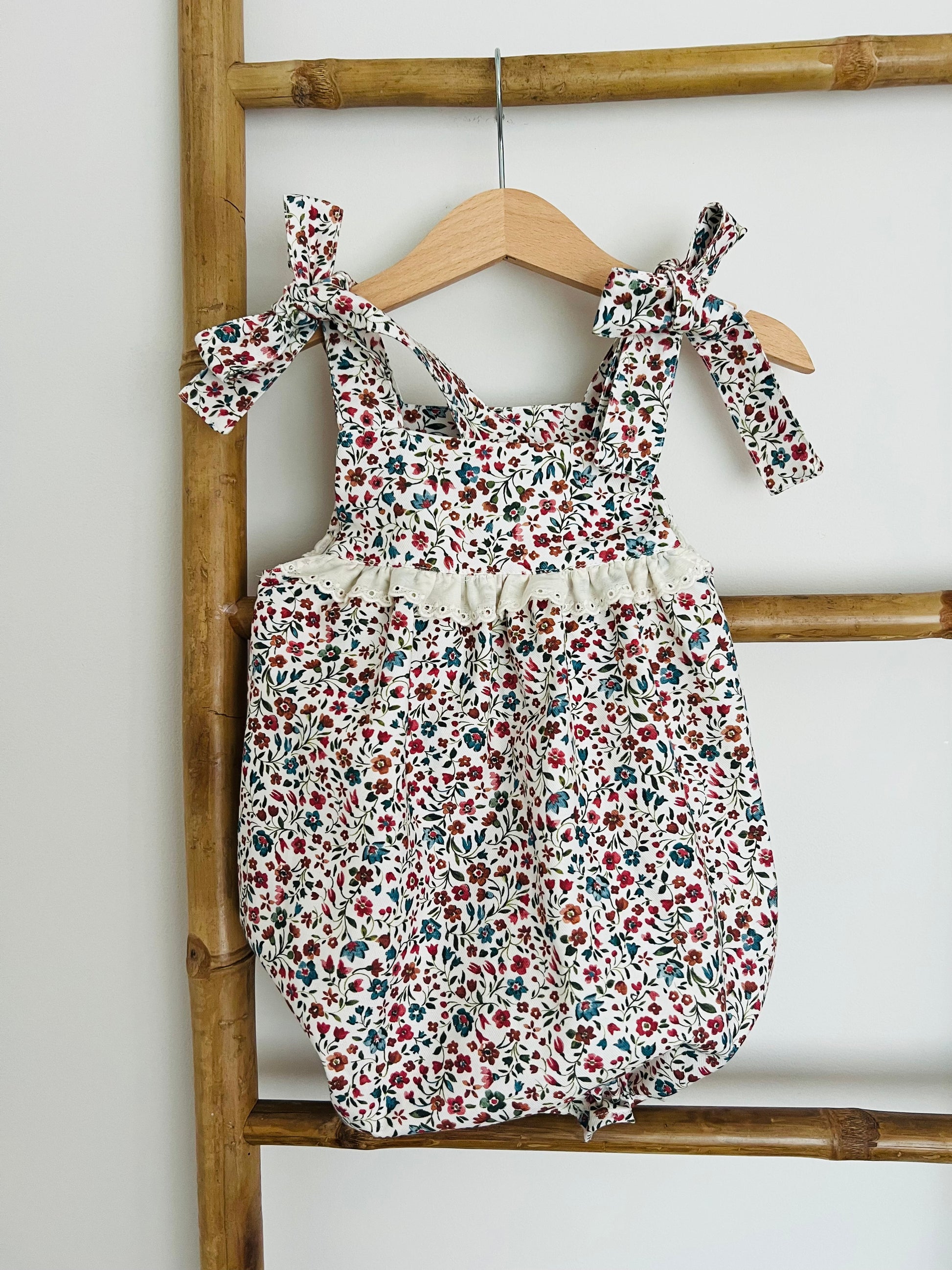 The Fofo Frederica is a charming piece, with a white background and a delicate floral print in shades of pink and blue , which gives it a fresh and romantic look.