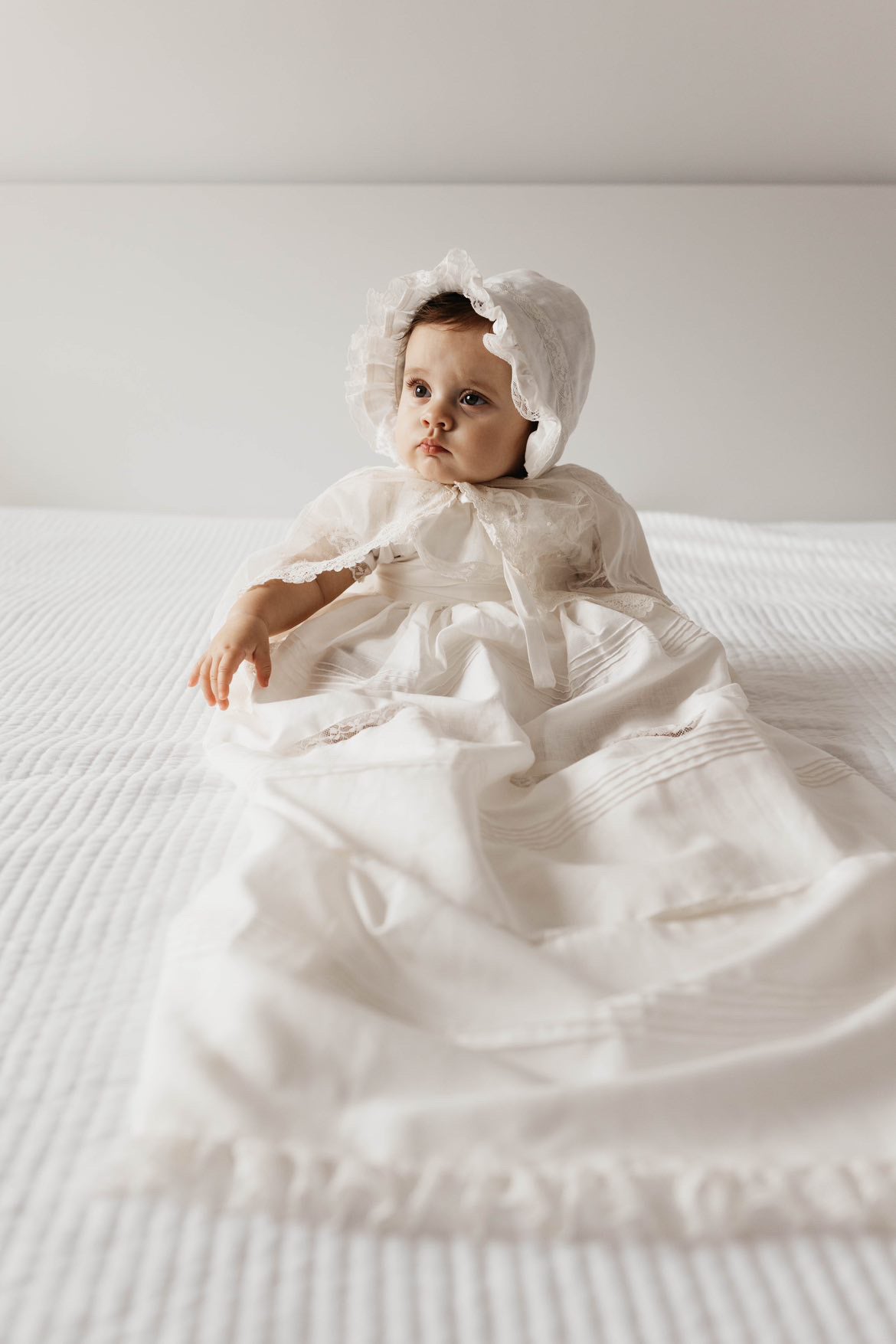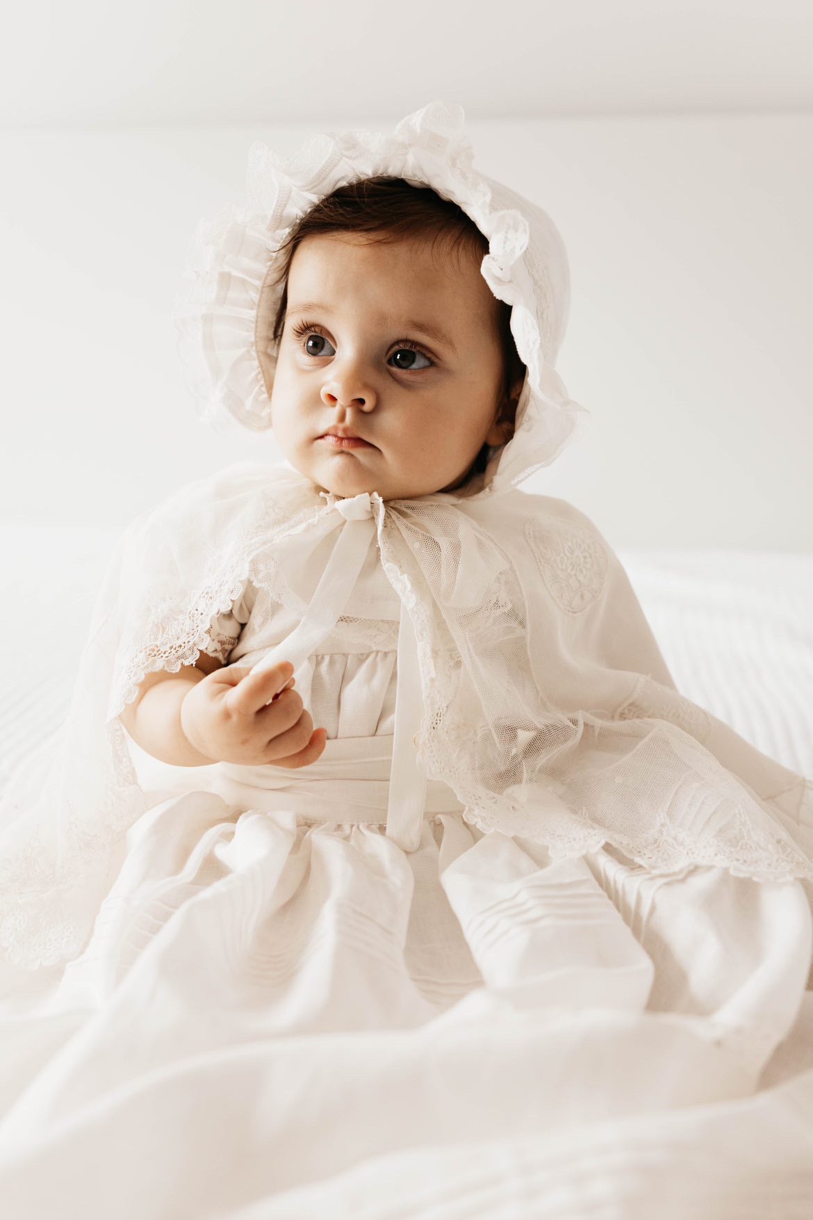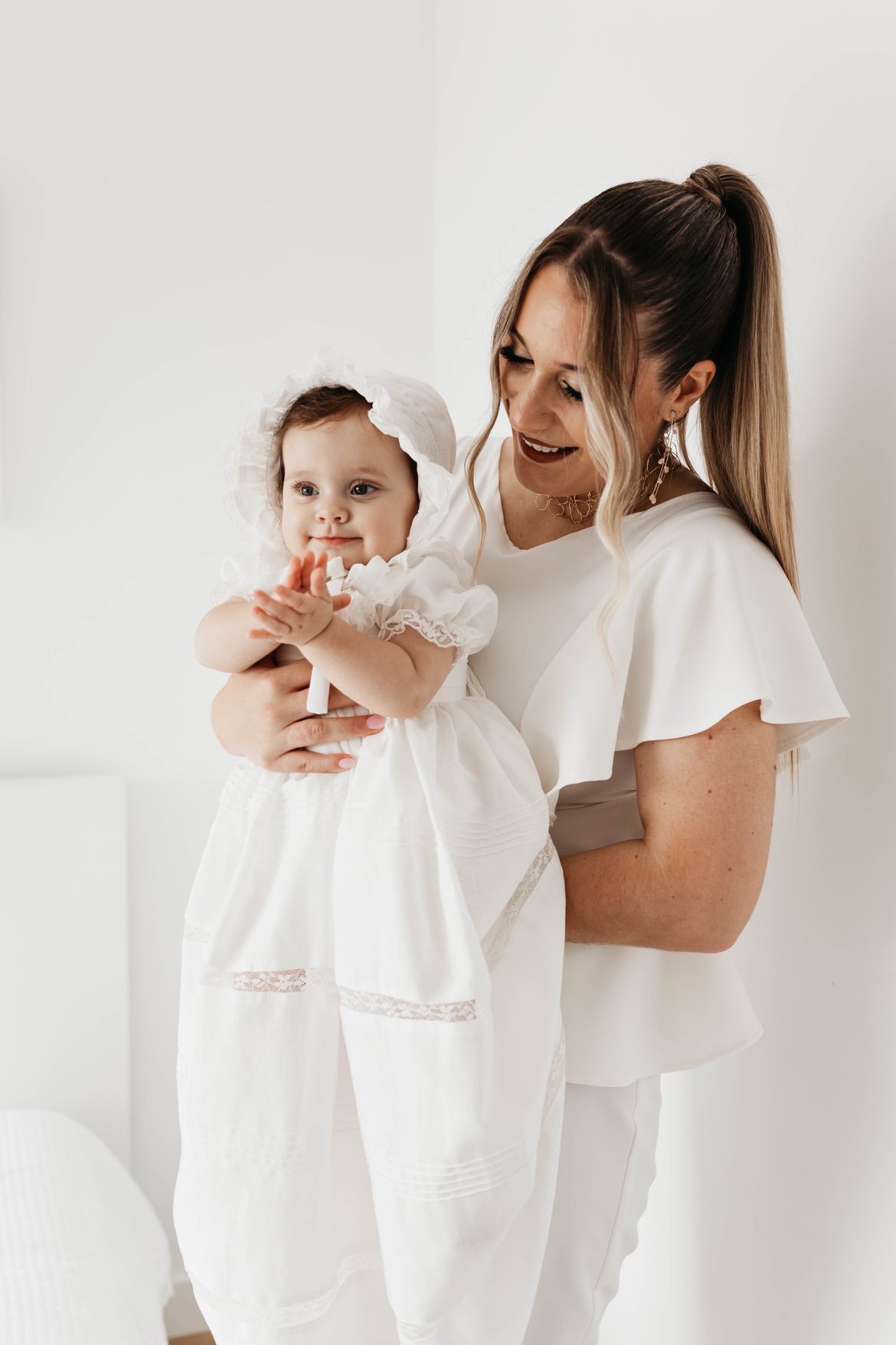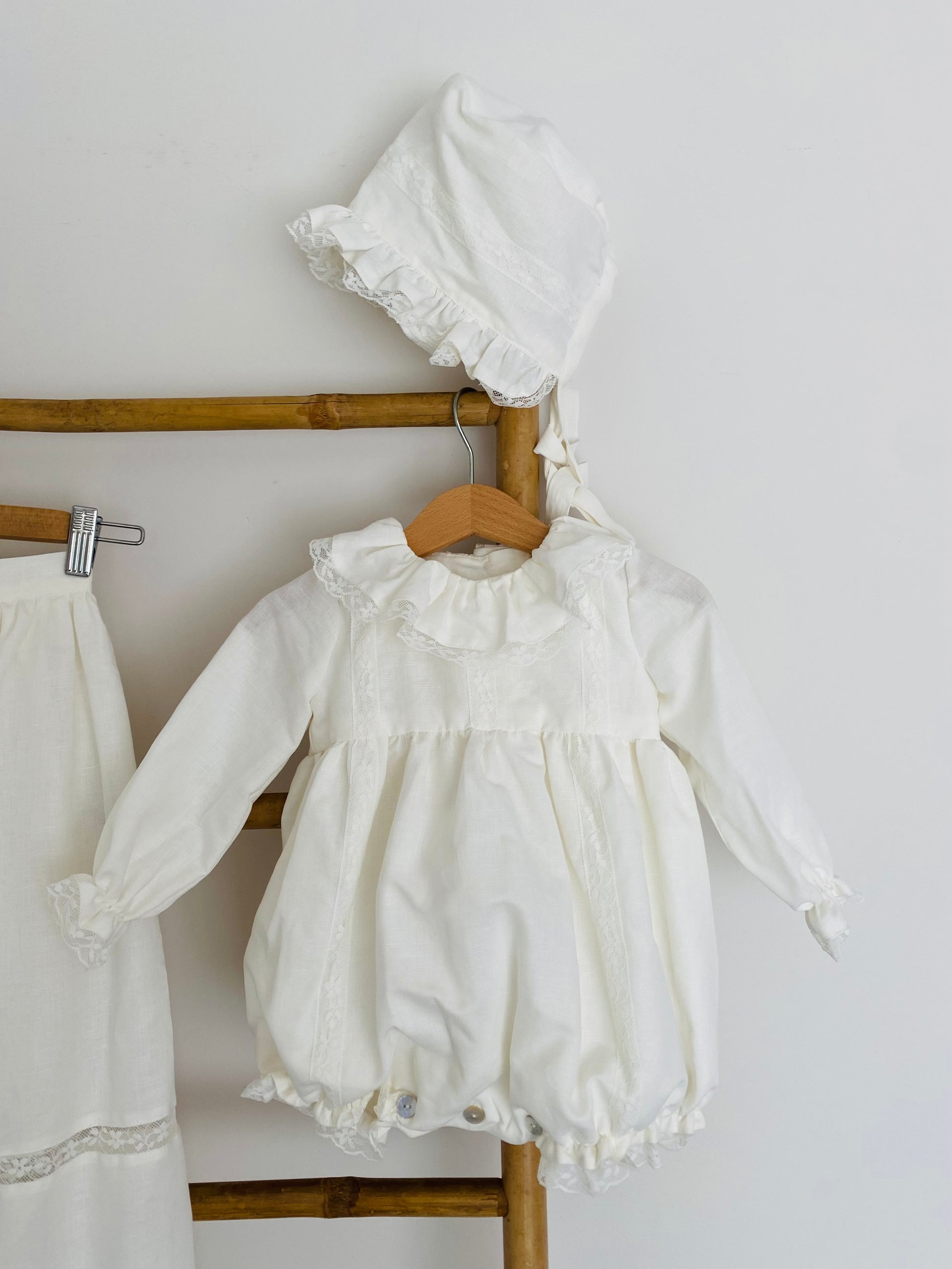 A formal shawl made entirely of linen, lined with 100% cotton fabric, with Valencian lace trims that give it a very elegant and simple touch. This style is increasingly being chosen with a removable skirt.