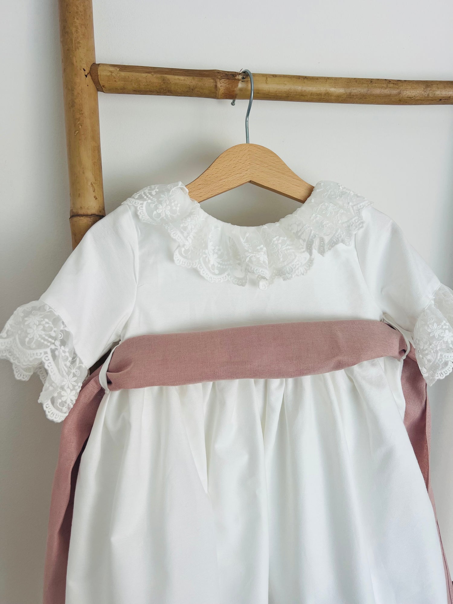 O corte clássico ganha vida com pormenores em rendas largas e delicadas, aplicadas à mão, que tornam cada peça única. As mangas compridas, o forro duplo em algodão suave e o acabamento cuidado no peito e na bainha criam um equilíbrio perfeito entre simplicidade e requinte.