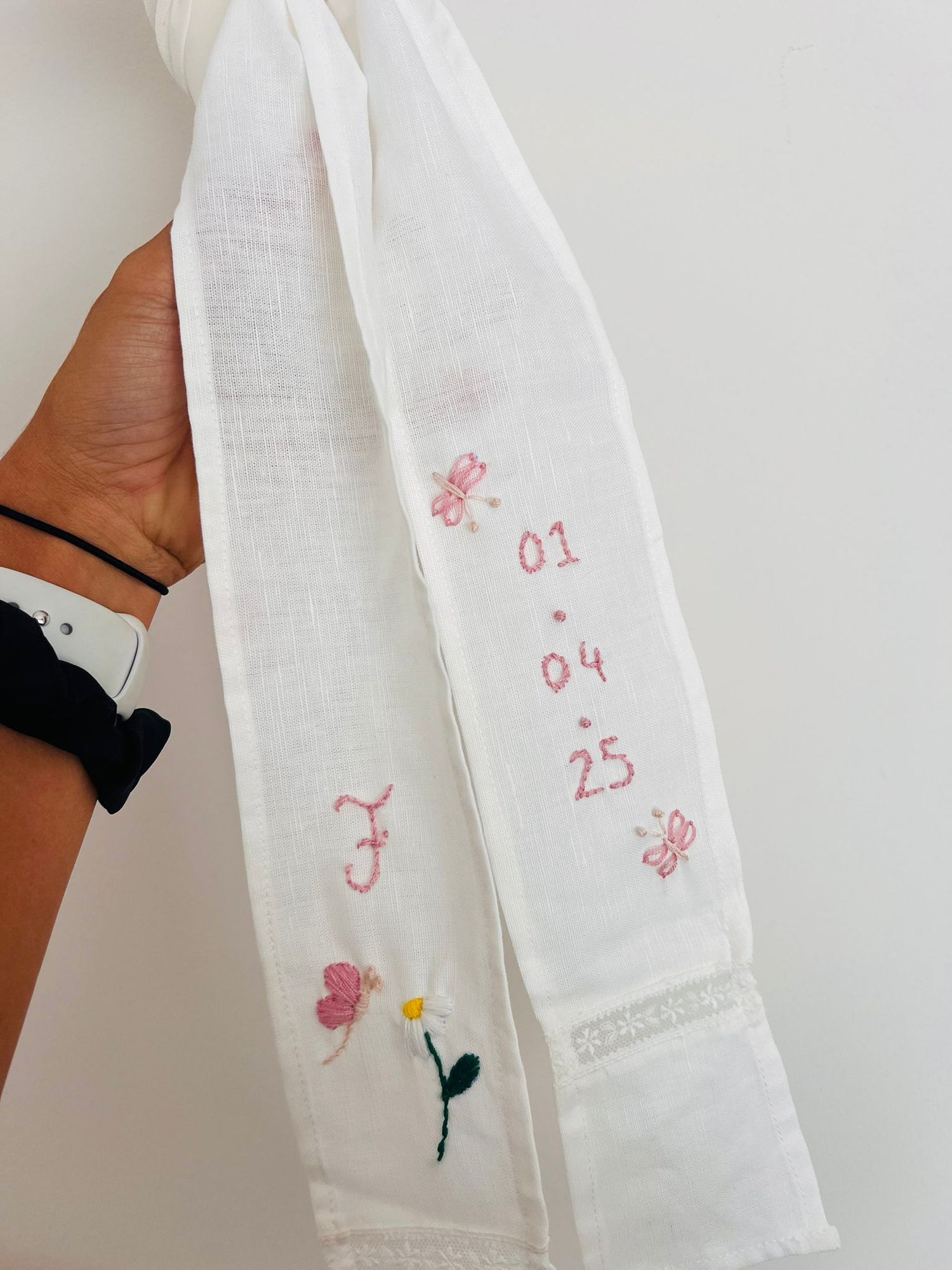 Um detalhe único e cheio de significado para eternizar o dia especial. A faixa em tecido branco delicado recebe bordados manuais personalizados — como iniciais, data da cerimónia e pequenos elementos decorativos (flores, borboletas, símbolos religiosos ou temáticos). Cada detalhe é feito à mão, conferindo exclusividade e um toque artesanal que torna a peça uma recordação inesquecível do batizado.